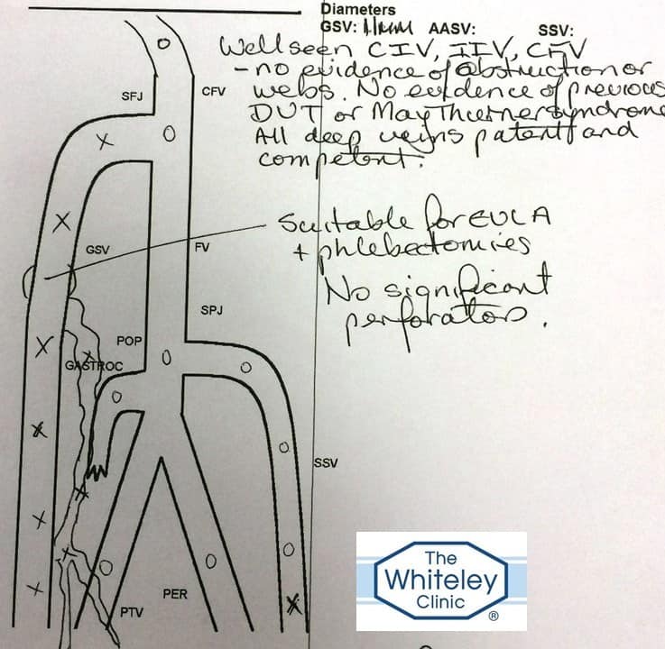 The patient did have some small varicose veins on her calves which had been noted previously. However she had gone to a teaching hospital in London where she underwent an old-fashioned venogram and was told that the veins had no blockages in them. She had a venous duplex ultrasound scan performed elsewhere which suggested that her veins were generally working normally but she might have some small perforators.